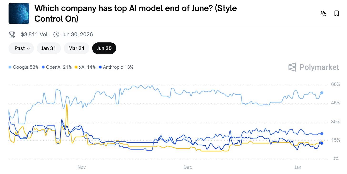 AIに関する予測も多数あります例えば、どの会社が2026年6月末にもっとも性能の高いAIモデルを持っているか、だと、53%がGoogleと考えているようです。