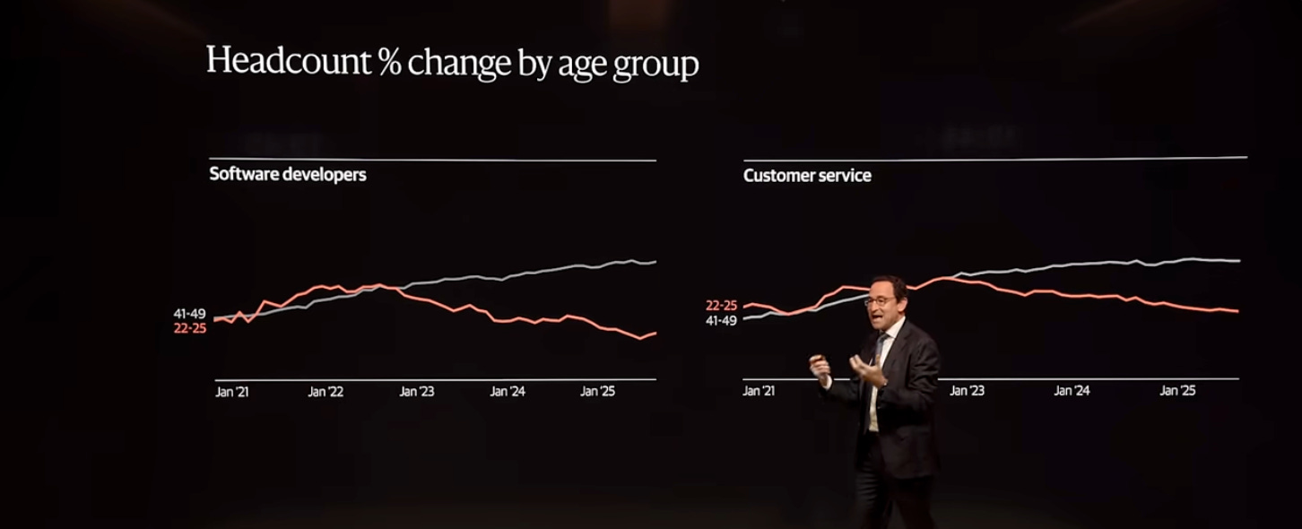 実際のところ、企業現場での価値の定着はまだら模様と言えますが、最近の雇用データからは、影響の輪郭が鮮明になりつつあります。たとえばエントリー層のソフトウェア職は明確に逆風で、SignalFireの2025年レポートは「エントリーレベル採用が崩壊」とまで表現しています。