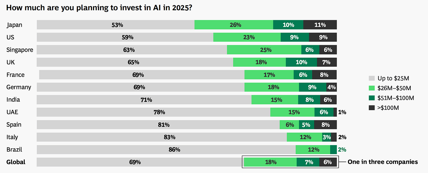 冒頭中川氏は、BCGの調査結果として各国企業のAIへの投資意欲の比較を示しました。それによると日本企業の約半数が2025年に35億円以上の投資を予定しており、調査対象国の中でも最も積極的な姿勢が明るみに出ました。